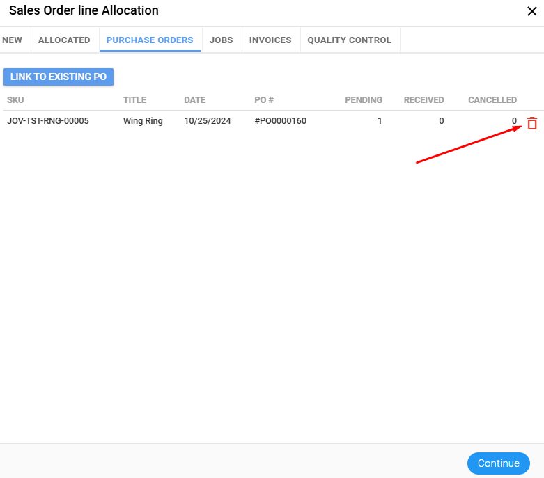 In the opened dialogue, you will see the allocated Purchase Order. To unlink it, press the trash button on the right, then click Continue.