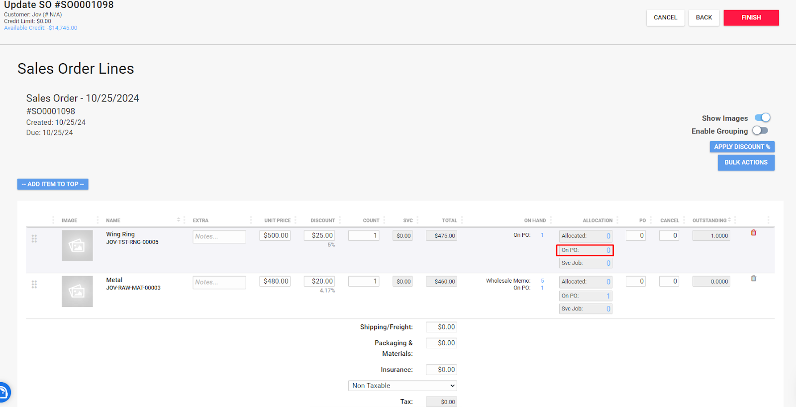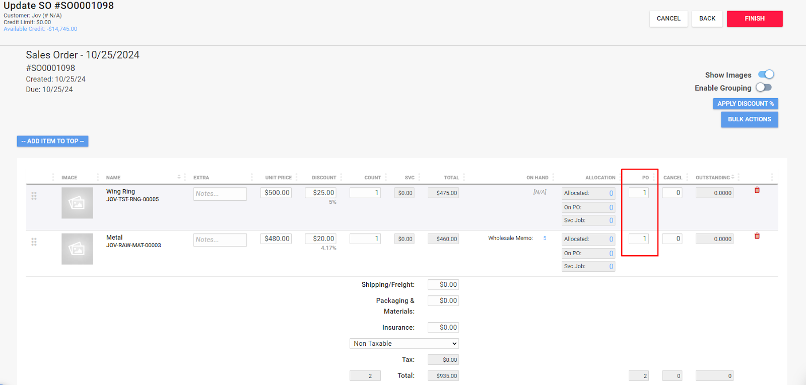 Locate the Allocation column on the right side of the screen and click on the number “1” next to the On PO field.