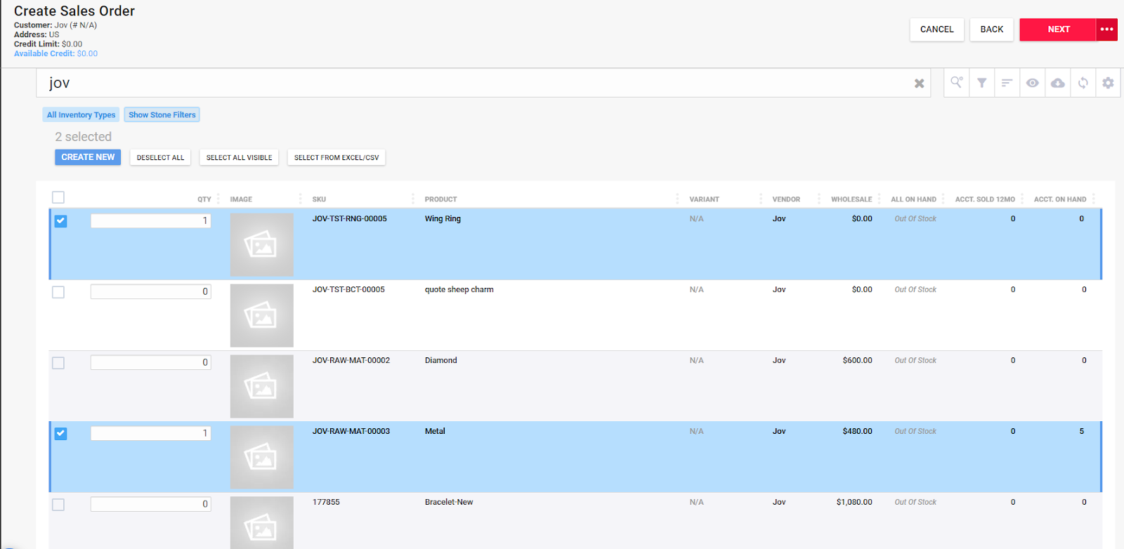 You can select items by scanning with a barcode scanner, choosing them manually from the list, or uploading a spreadsheet using the Select From Excel or CSV button.