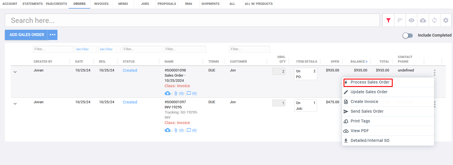 To process the Sales Order, click the three-dot button located in the last column of your grid.