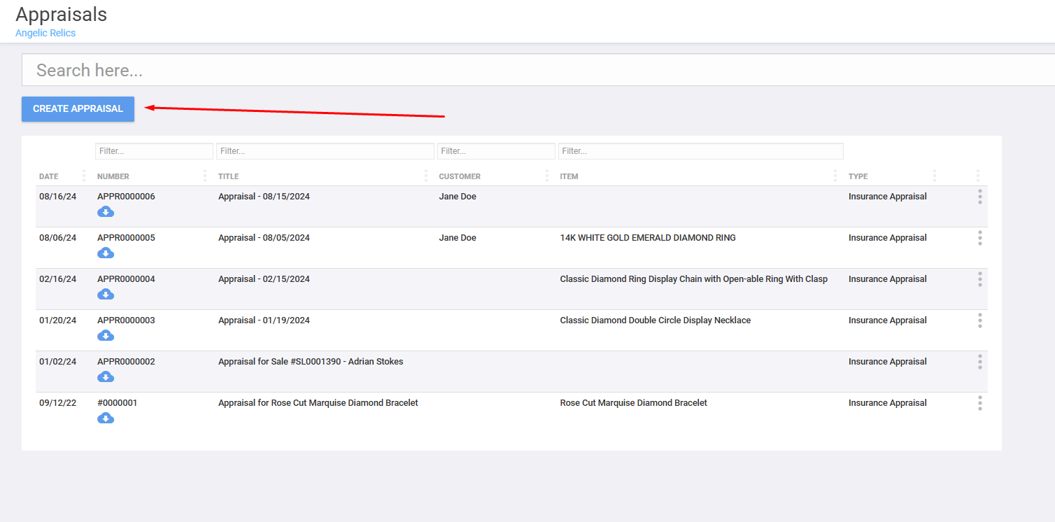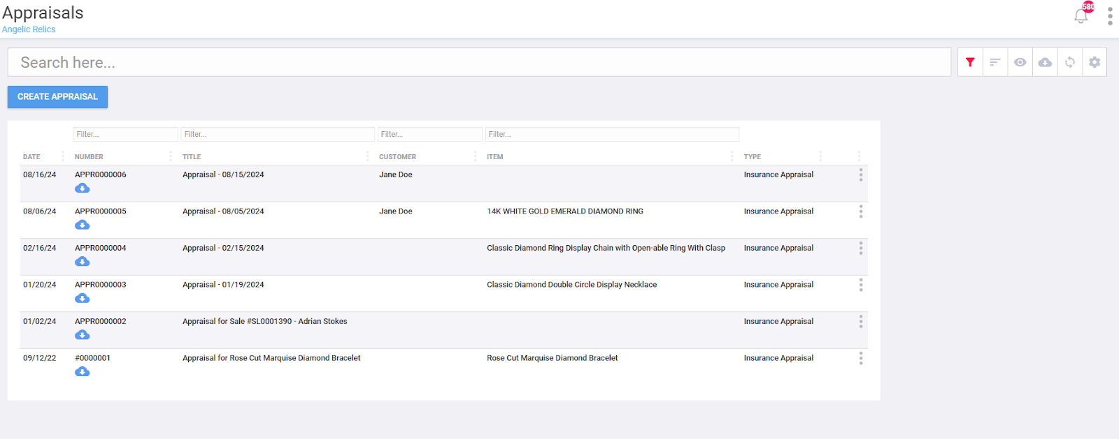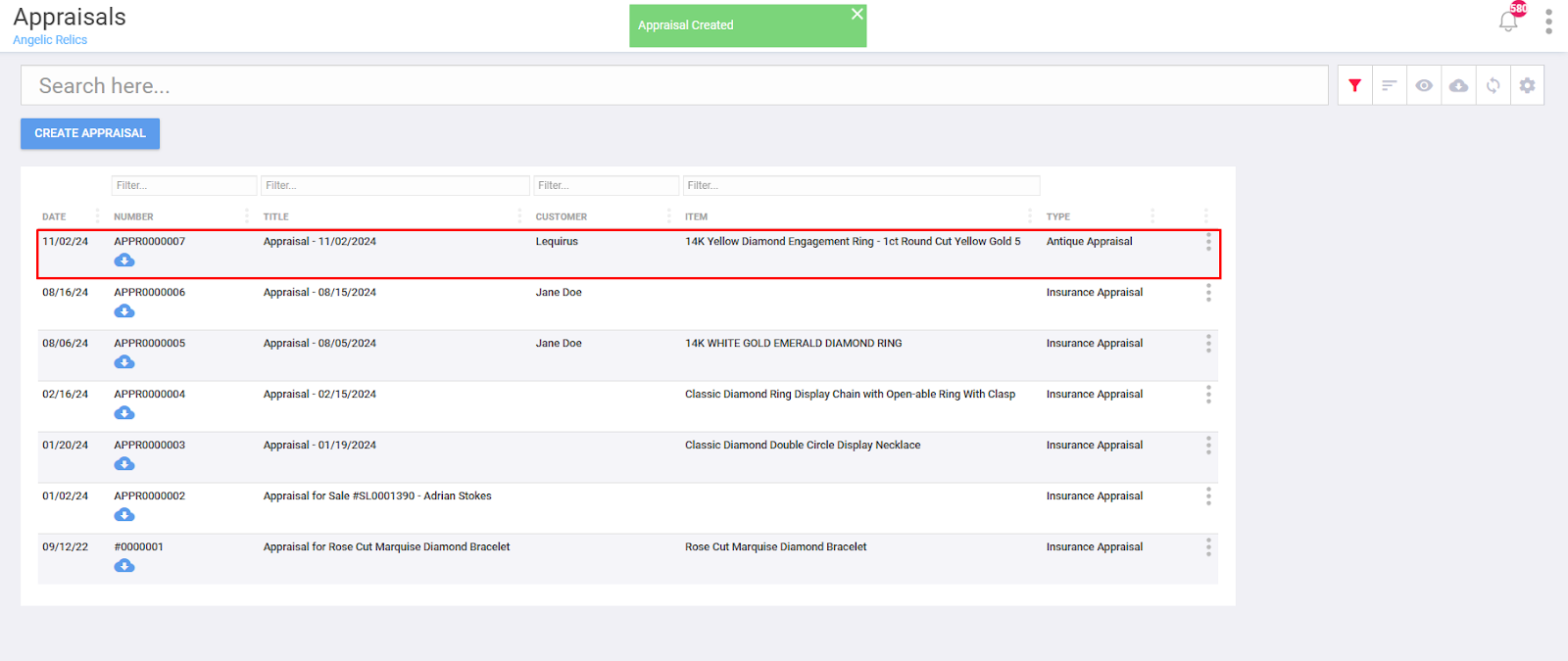 In this module, you'll see all your previously created appraisals, displayed in a data grid format that allows filtering and exporting.