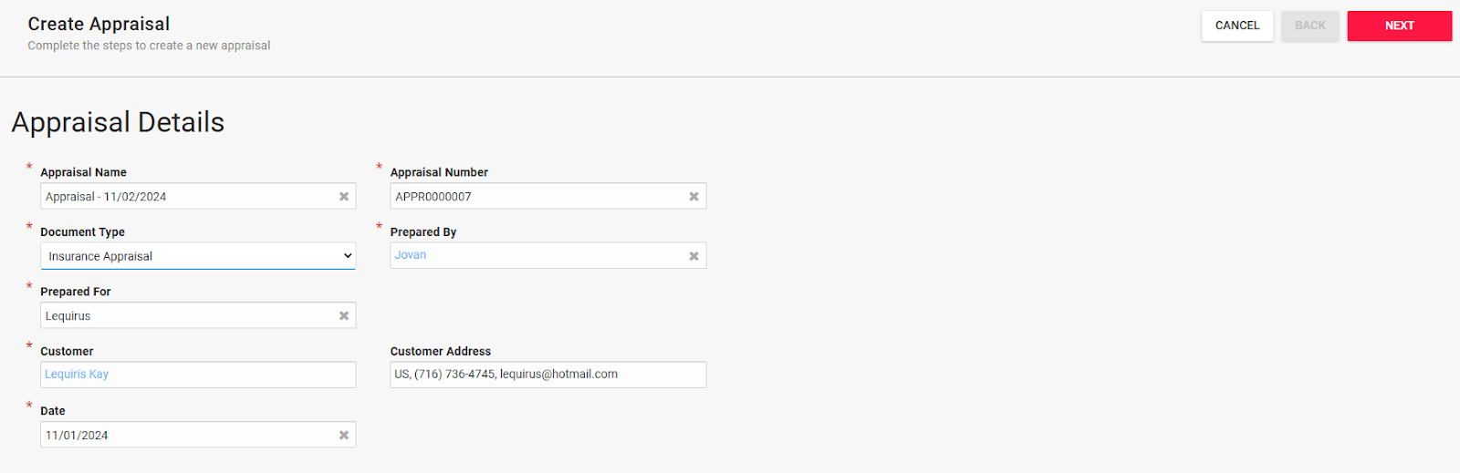 Fill out the appraisal details, including the name, appraisal number, and most importantly, the Document Type and the recipient of the appraisal.