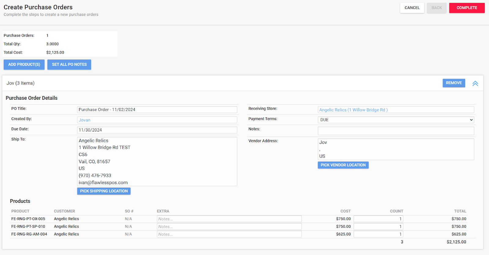 Note: If you select items from different vendors, you will be prompted to create multiple purchase orders.
