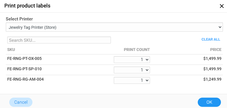 A new dialog named Print Product Labels will open, displaying the list of selected items and their quantities (defaulted to one, but adjustable).