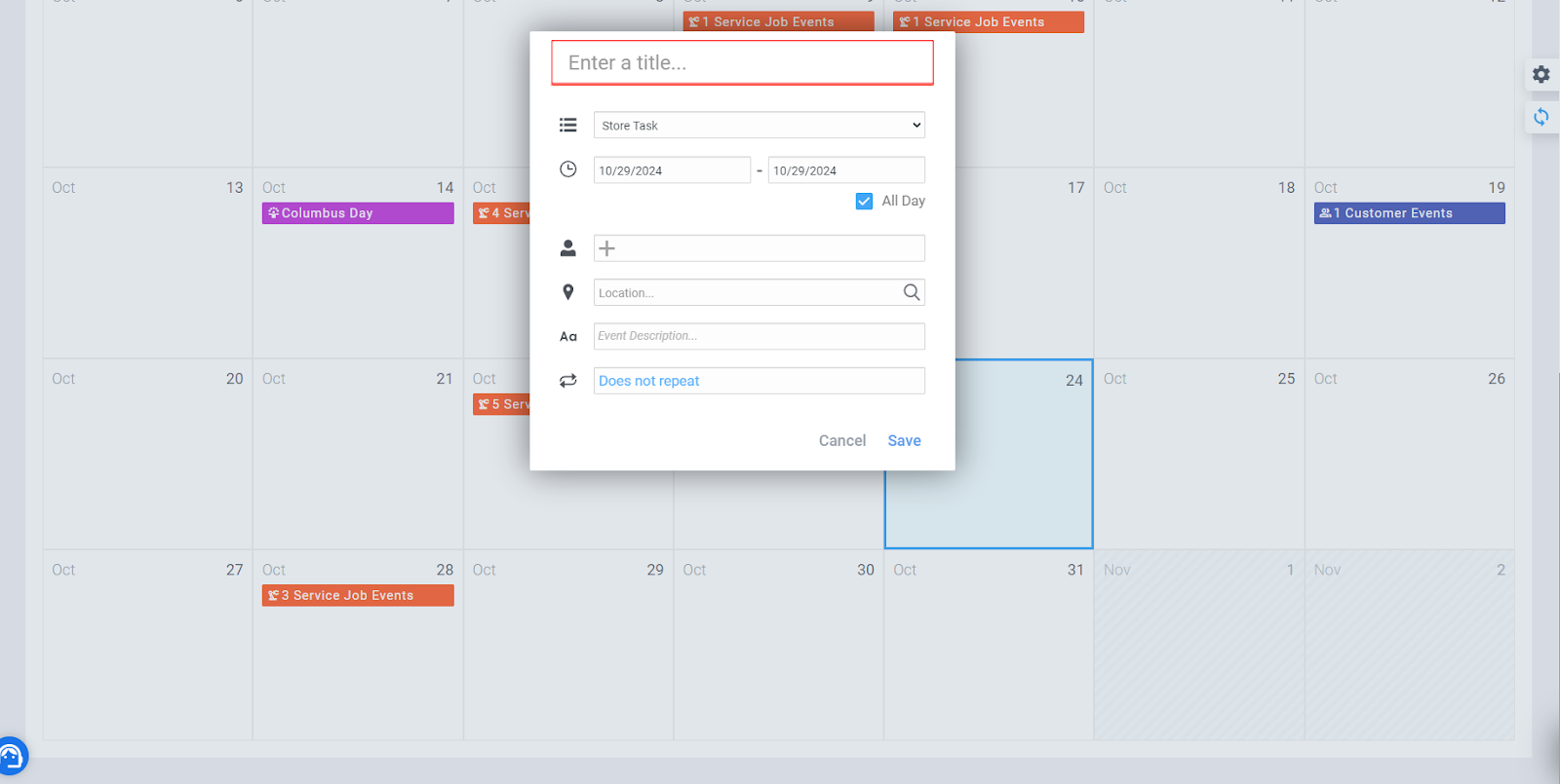 On October 28th, you’ll notice a service job scheduled. Clicking on the event opens a dialog containing more details, such as: