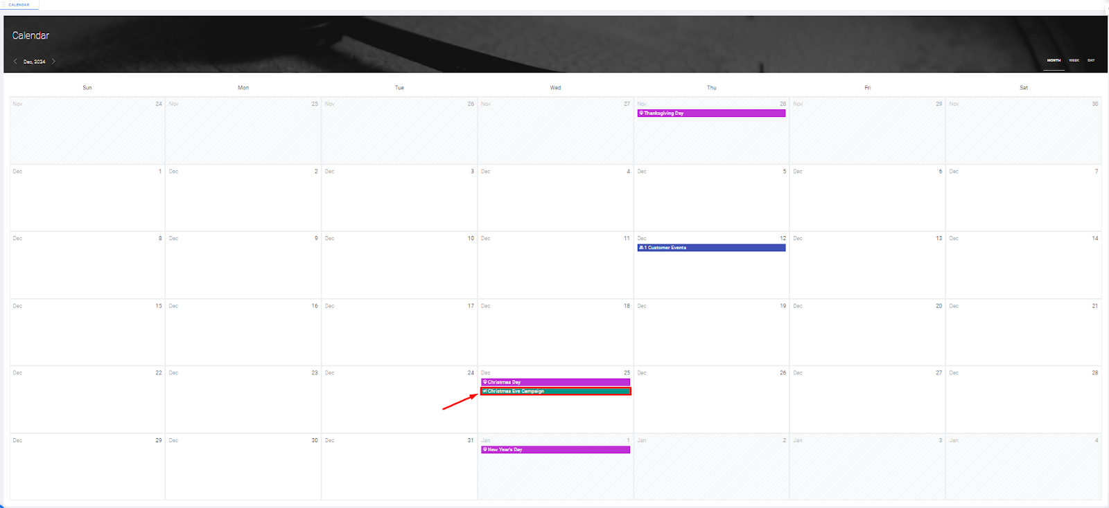 After finishing the campaign setup, the event would automatically be saved in your calendar. To confirm this, we will head over to the date in which the campaign was scheduled. In this example, it would be on December 25, 2024 at 12:00 AM.