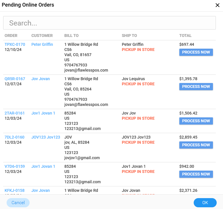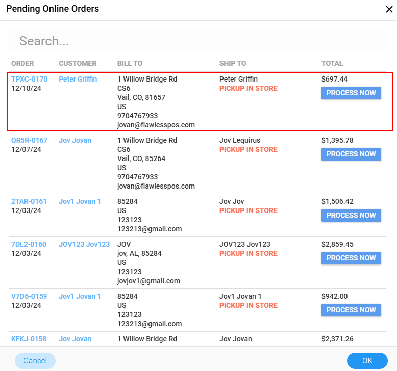 Locate the order you want to process and click the Process Now button on the right. For this example, we’ll be processing the first order at the top of the list made by the customer named Peter.
