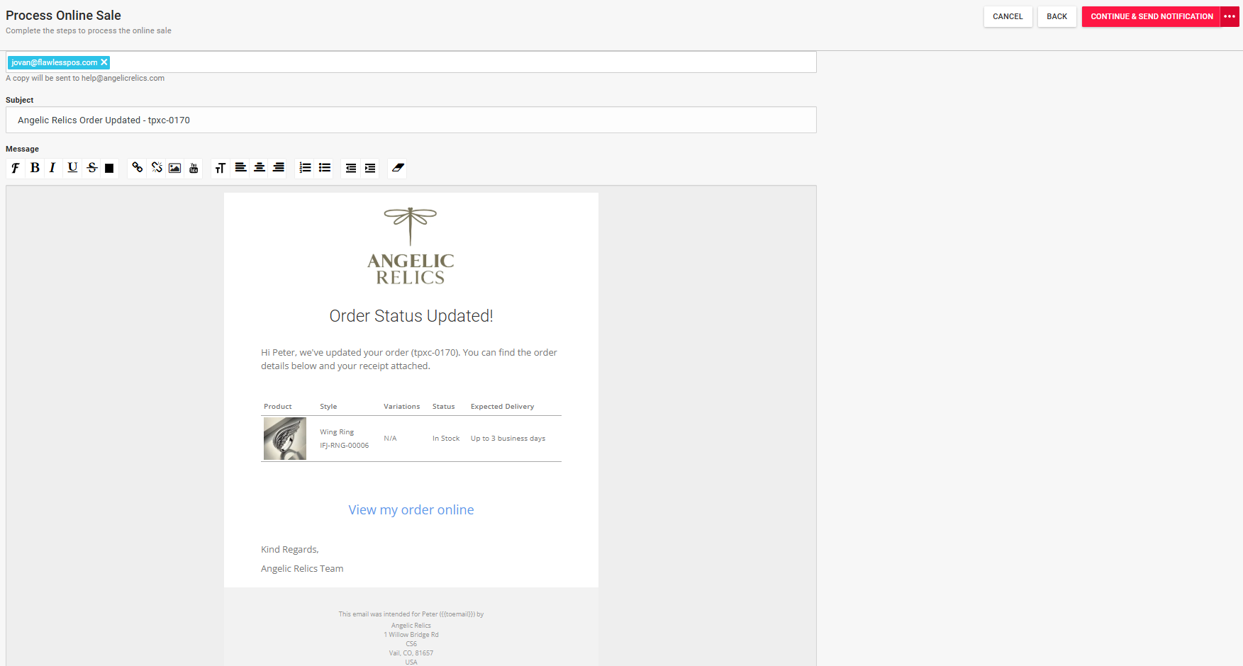 Note: You may also be able to send the order without any notification by clicking on the three-dotted button located at the right side of the Continue & Send Notification button.