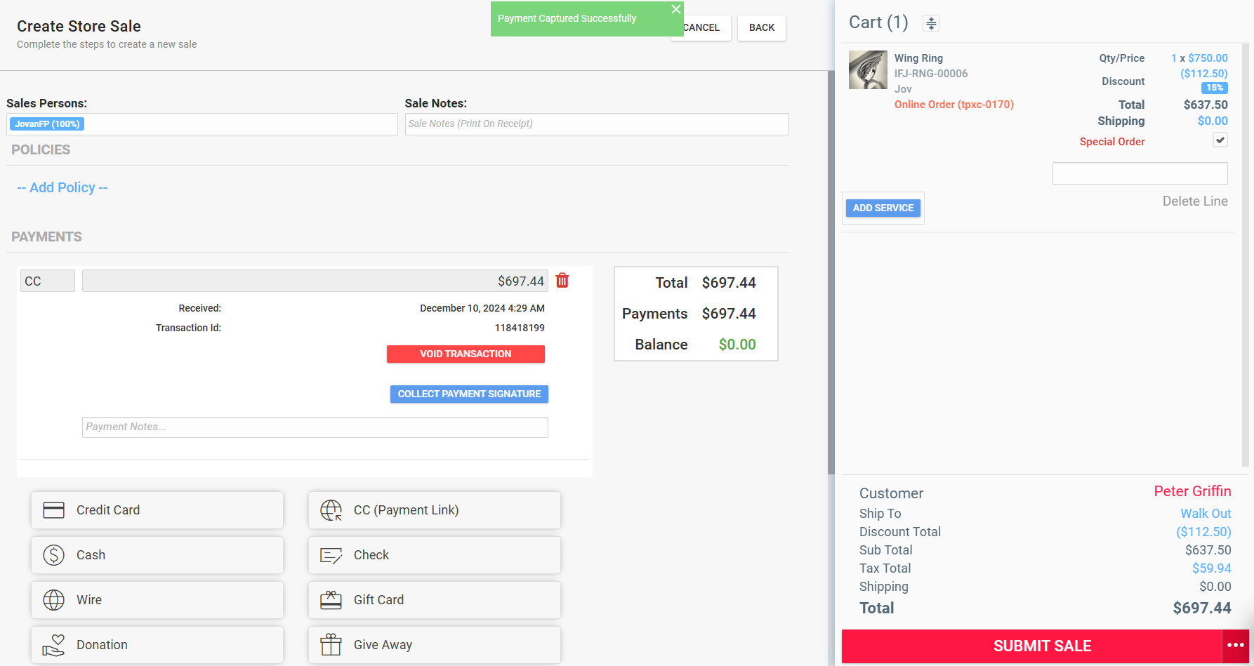 Capture Transaction - This finalizes the payment. It's important to note that you must capture the funds to proceed with submitting the sale. Without capturing the funds, the sale cannot be finalized..