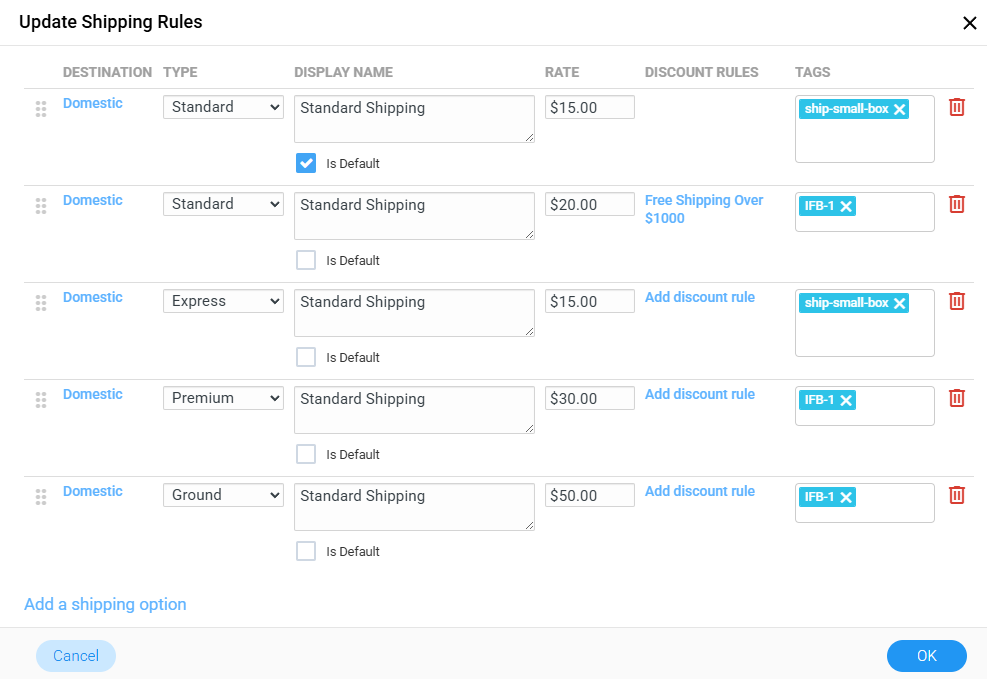 You can build as many rules as needed, including a mix of standard, premium, Ground, and tag-based configurations.