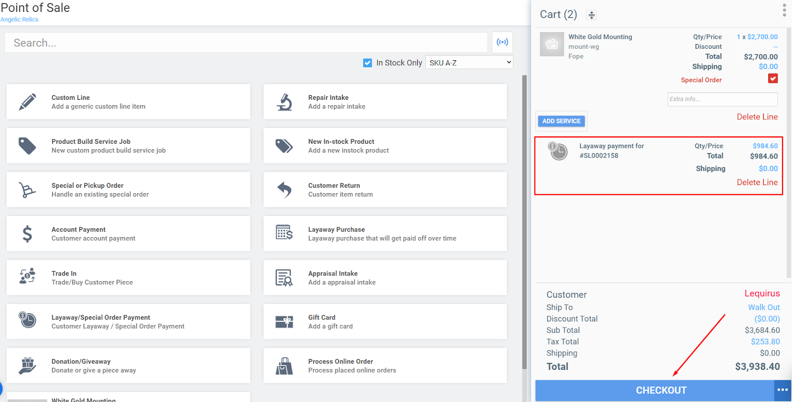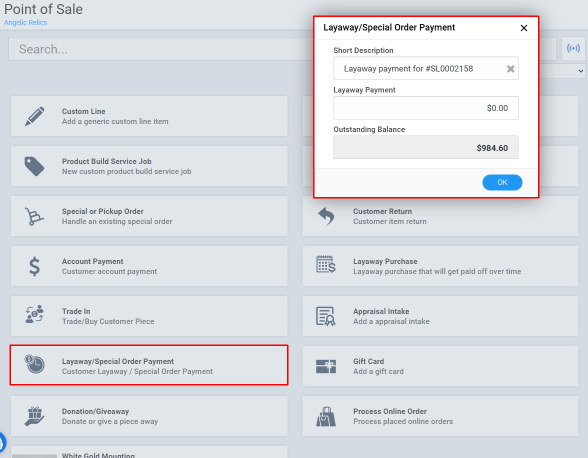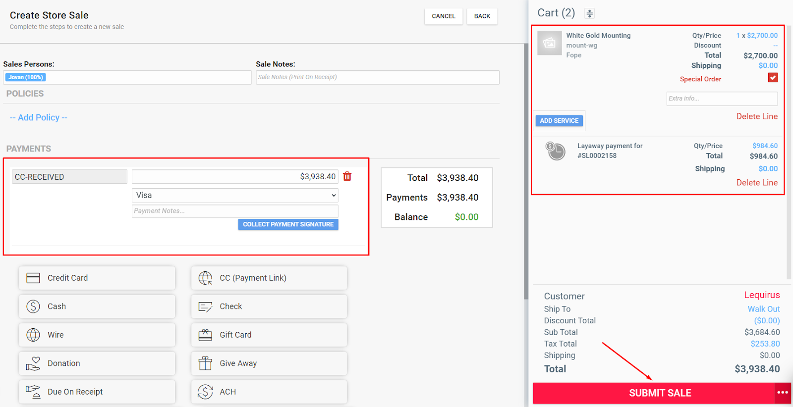 To process the payment for both items, add a layaway payment and link it to the initial sale (diamond).
