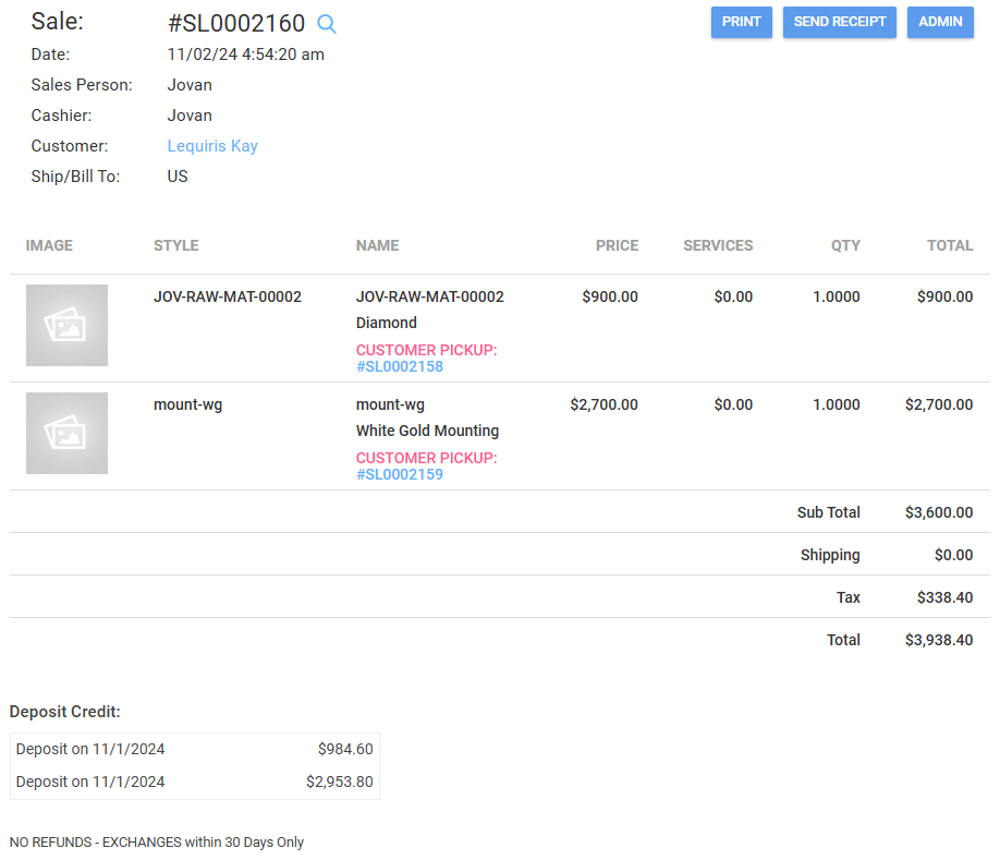 Complete the payment for both the diamond and the mount, combining the two into one final sale amount.