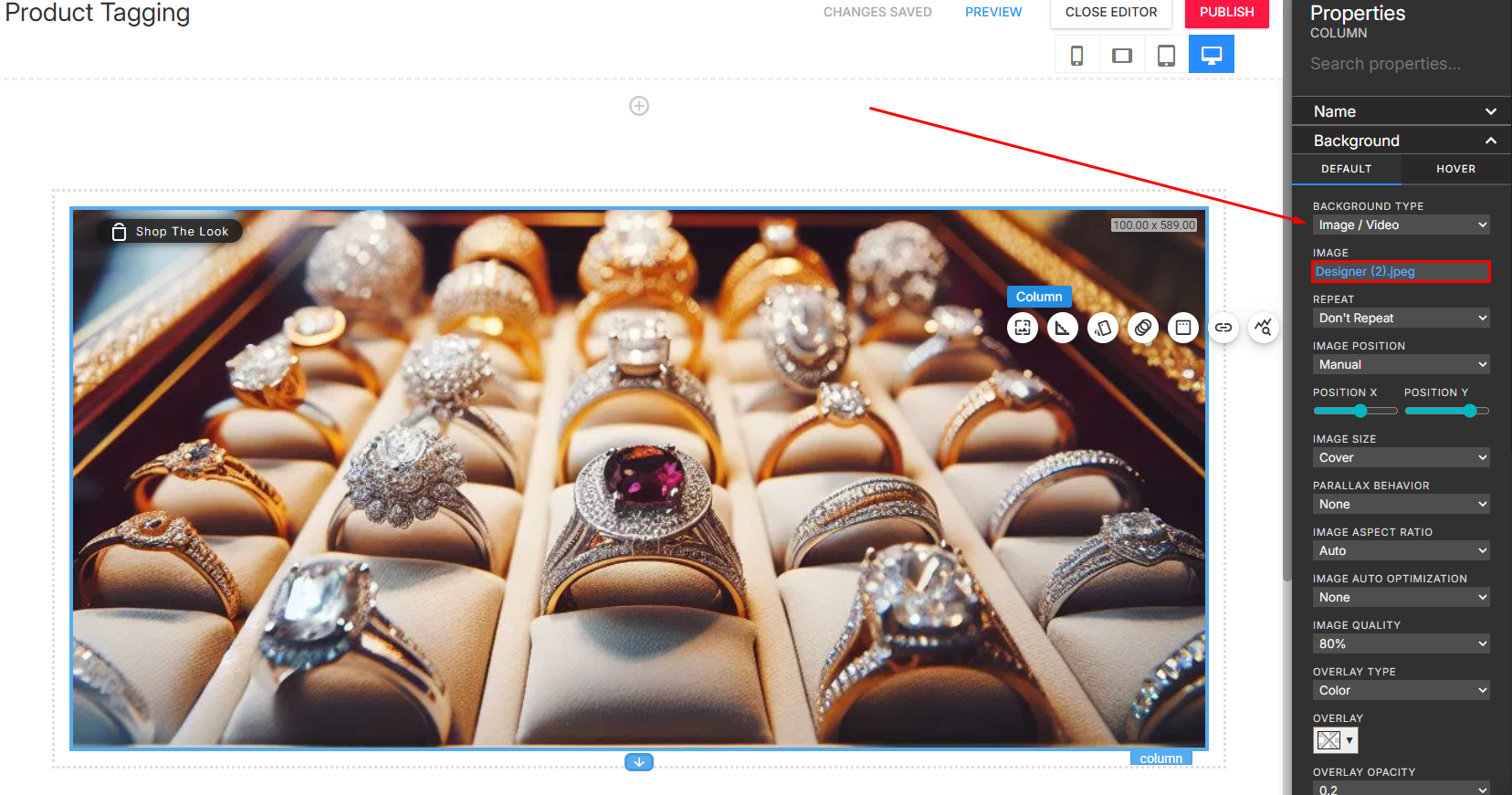 - A row can contain multiple columns and is mainly used for layout structure and spacing. Since the product tag feature relies on the selectable element that holds the image and its settings, it only appears when the image is applied to a Column background.