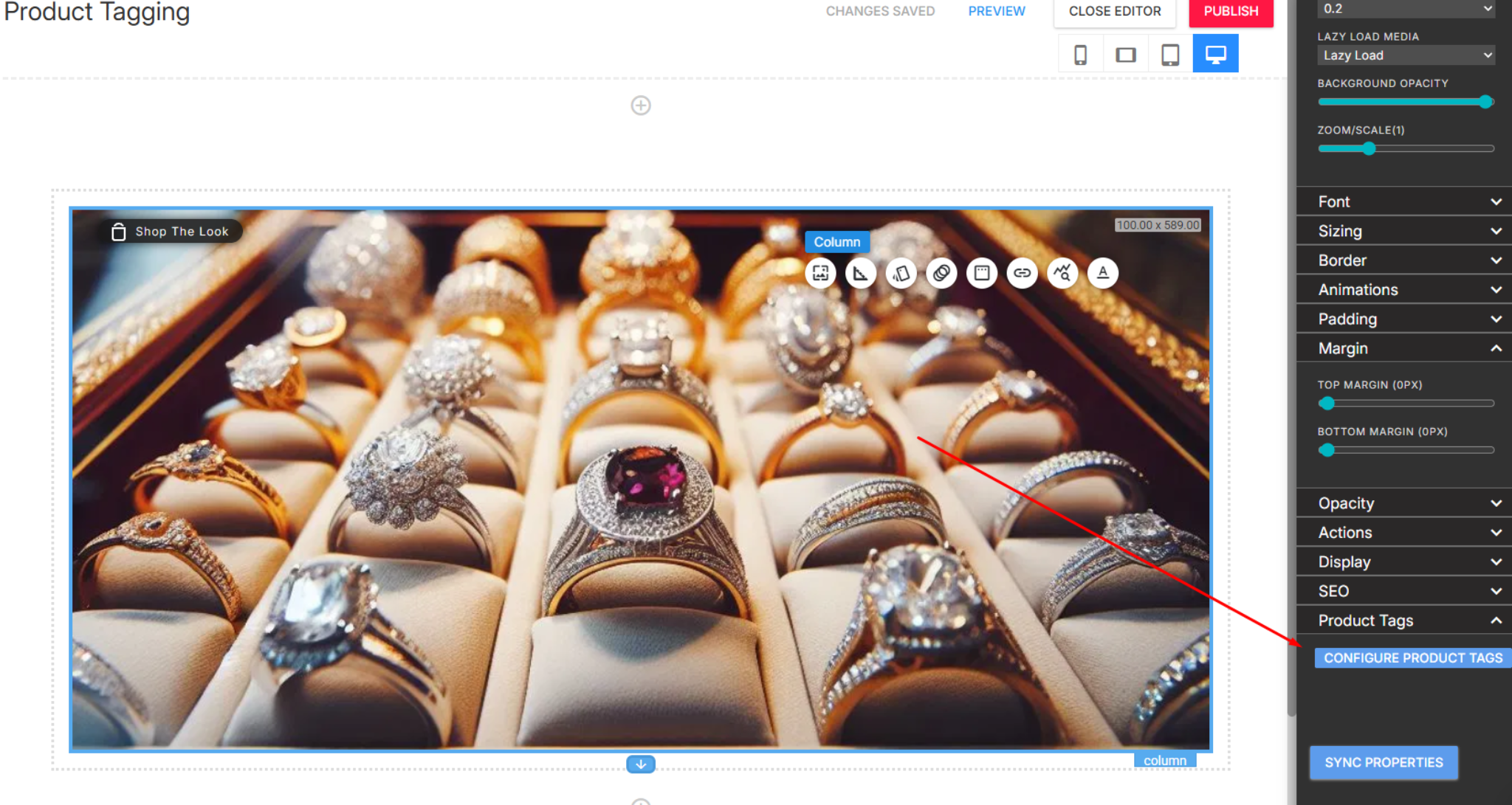 - Product Tagging is only available at the column level, because the tagging tool is tied to the Column properties panel.