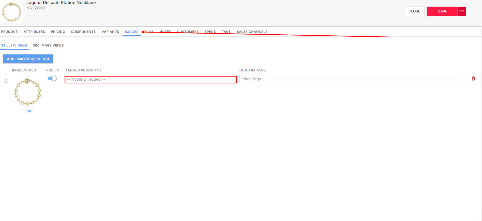 On the image row, locate the Tagged Products field.