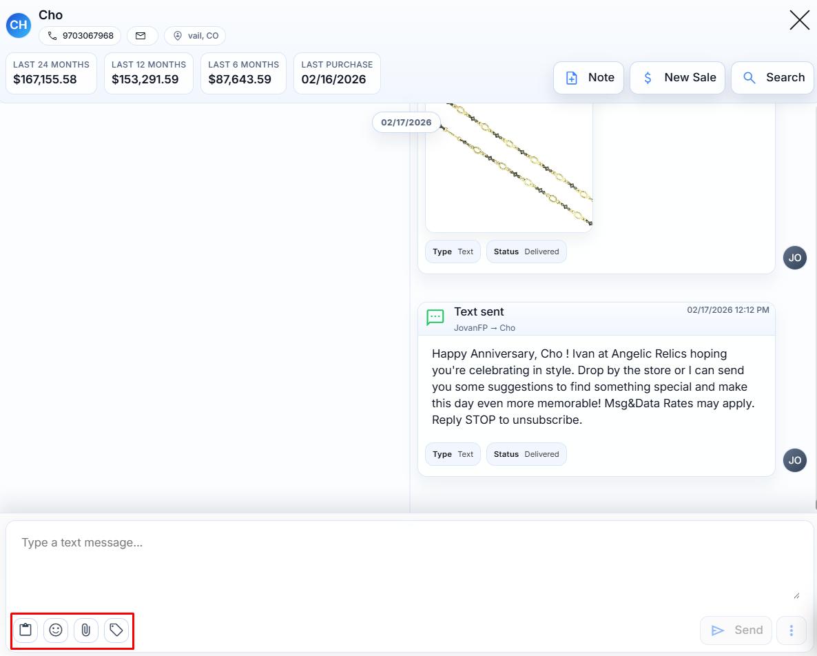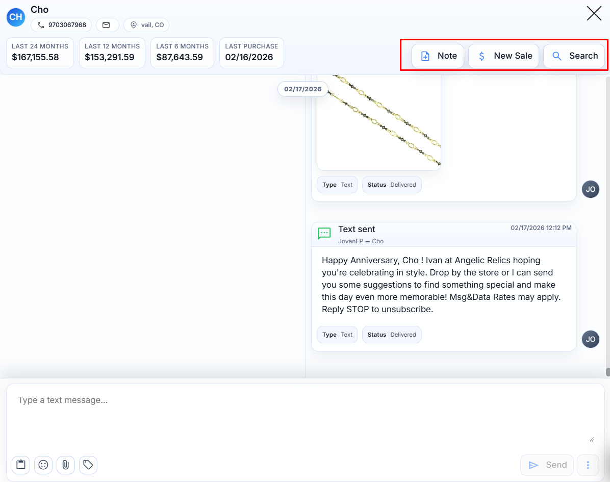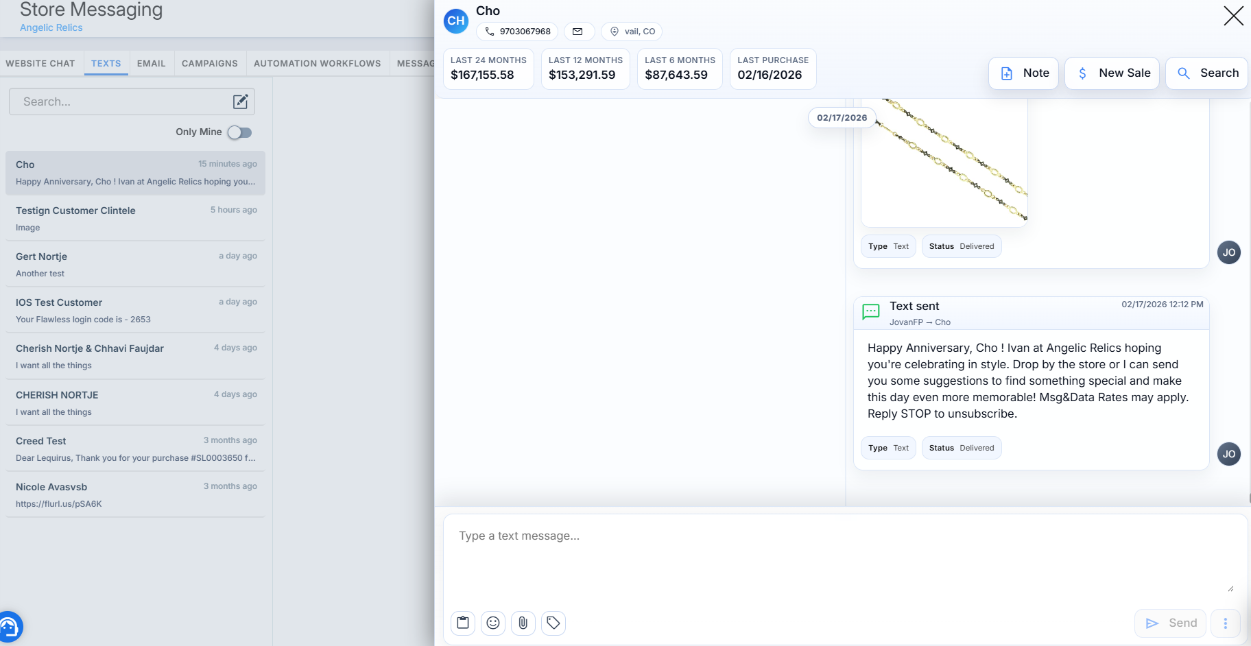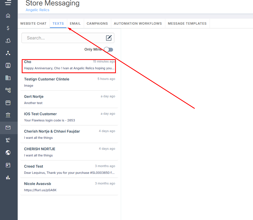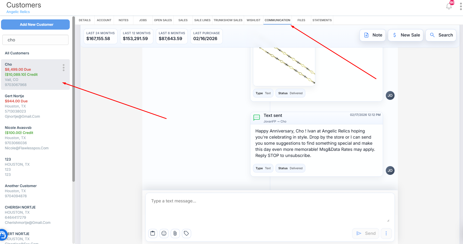 You can also access the same customer communication view from the customer’s communication module or via the store messaging module under the Text tab.